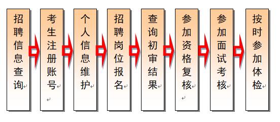 1)登录招聘报名系统。 2)通过首页左栏“报名导航”下的"招聘岗位查询",查询相关招聘岗位。 3)通过首页用户登录窗口下的“注册”功能,取得考生个人帐号和密码。 4)以个人帐号登录系统后,通过"个人信息维护"功能,补充、修改、完善个人报考信息。 5)通过“招聘岗位报名”功能,选报招聘岗位。 6)初审通过的考生,应按时参加资格复核。 7)通过资格复核的考生,应打印本人准考证,参加面试。
